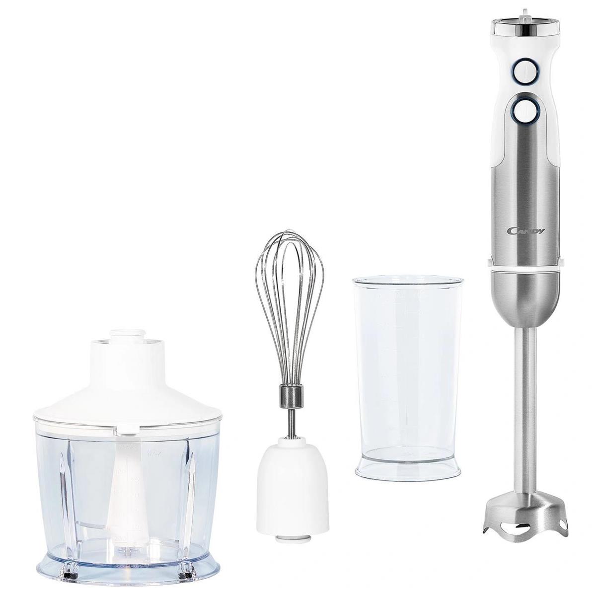 Погружной блендер Candy CB-200 мощностью 1200 Вт оснащен шестью скоростями измельчения продуктов. Максимальная скорость составляет 16000 об/мин. Погружная часть и лезвия выполнены из нержавеющей стали. В комплект входят венчик, измельчитель емкостью 0,8 л, погружная насадка, также мерный стакан объемом 0,6 л. Корпус изделия выполнен из пластика.
