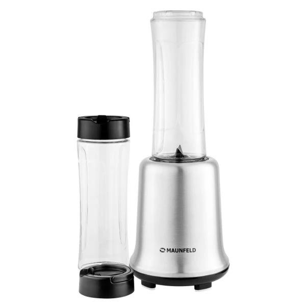 Блендер Maunfeld MF-122S из ударопрочного материала «Нержавеющая сталь». Два стакана объемом 0.6 литра удобно брать с собой например на прогулку. Скорость вращения 2200 об/мин способна размельчить все ингредиенты за короткое время. Синяя светодиодная подсветка добавит стиля и индивидуальности прибору.
