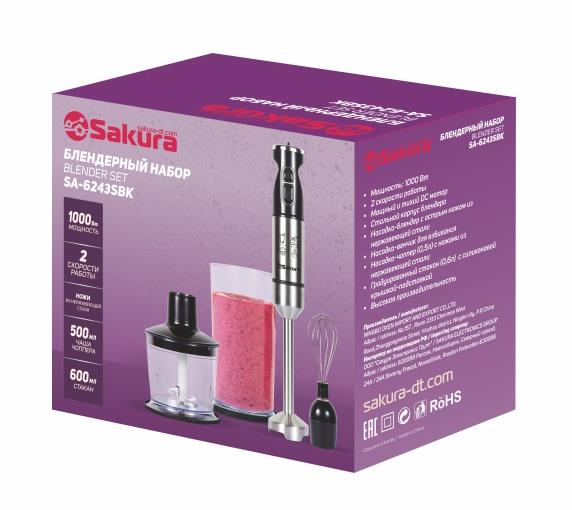 Блендер Sakura SA-6243SBK-1000 DC мотор 1000 Вт стальн.корпус венчик чоппер стакан (погружной/1000 Вт/серебристый, черный) - Интернет-магазин Позитив: бытовая техника, электроника, товары для дома и др.