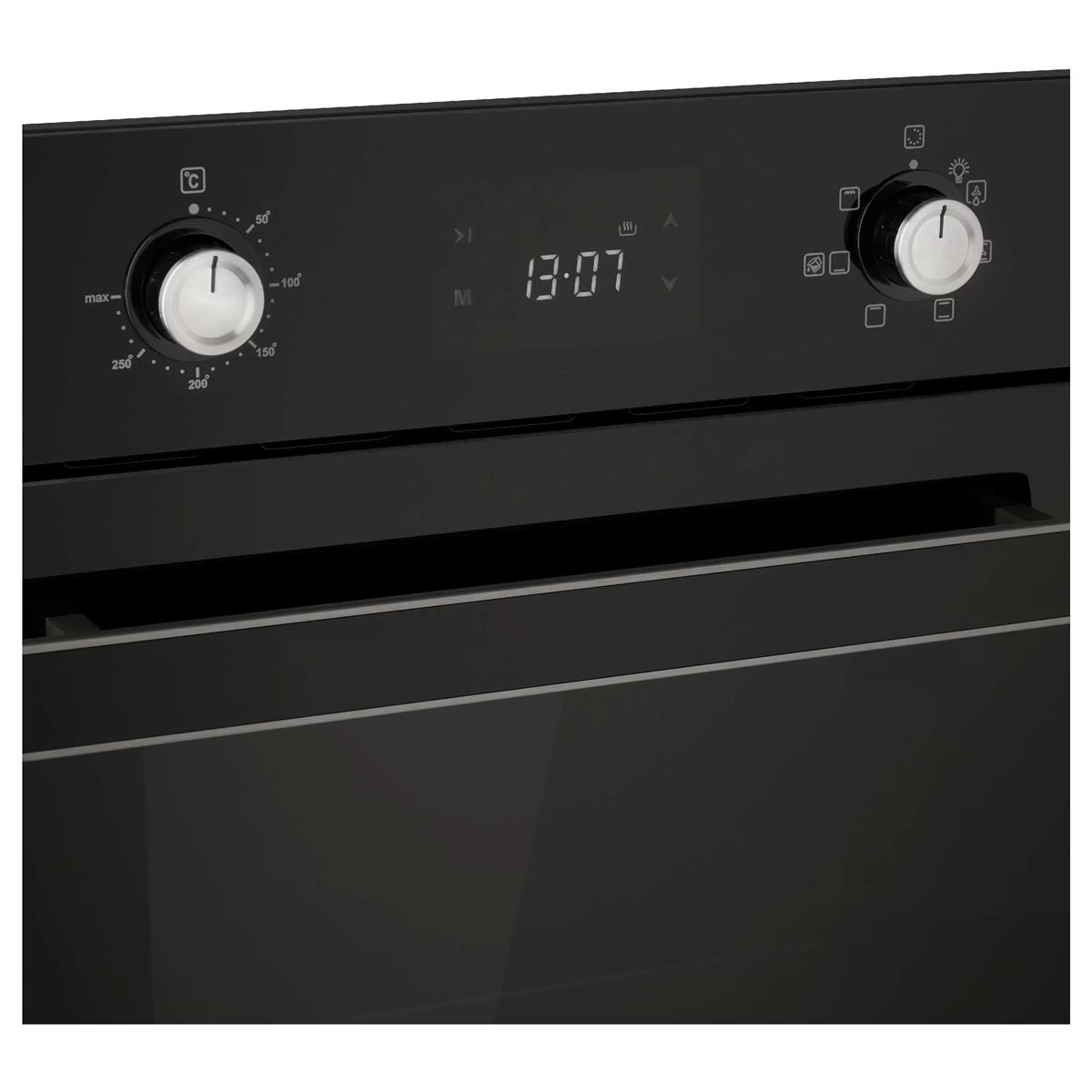 Evelux EO 430 PB — это узкий встраиваемый электрический духовой шкаф шириной 45 см, выполненный в лаконичном дизайне «Full Black» (черное стекло). Благодаря компактным размерам он оптимально подходит для небольших кухонь, при этом обладая полноценным функционалом для запекания при температуре до 300 °C.