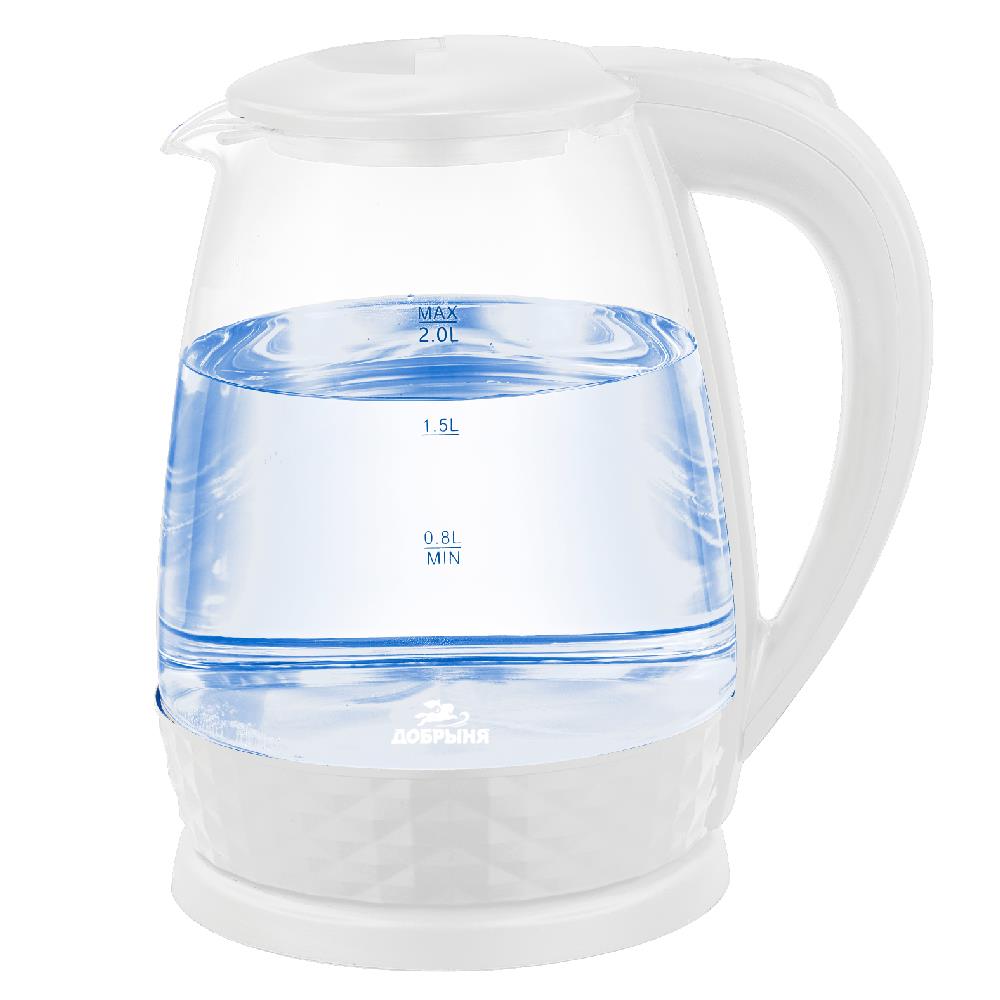 Электрический чайник Добрыня DO-1252W (1800 Вт/1,8 л /стекло, пластик/прозрачный, белый) - Интернет-магазин Позитив: бытовая техника, электроника, товары для дома и др.