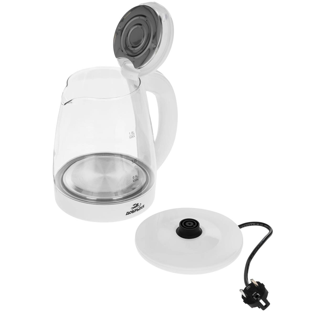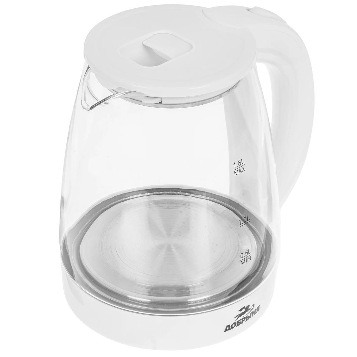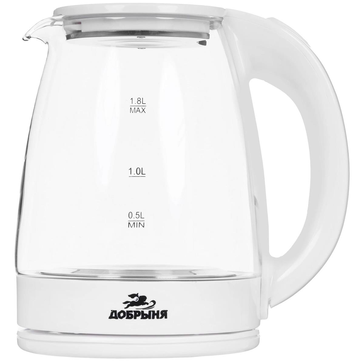 Электрический чайник Добрыня DO-1254W (1800 Вт/1,8 л /стекло, пластик/прозрачный, белый) - Интернет-магазин Позитив: бытовая техника, электроника, товары для дома и др.