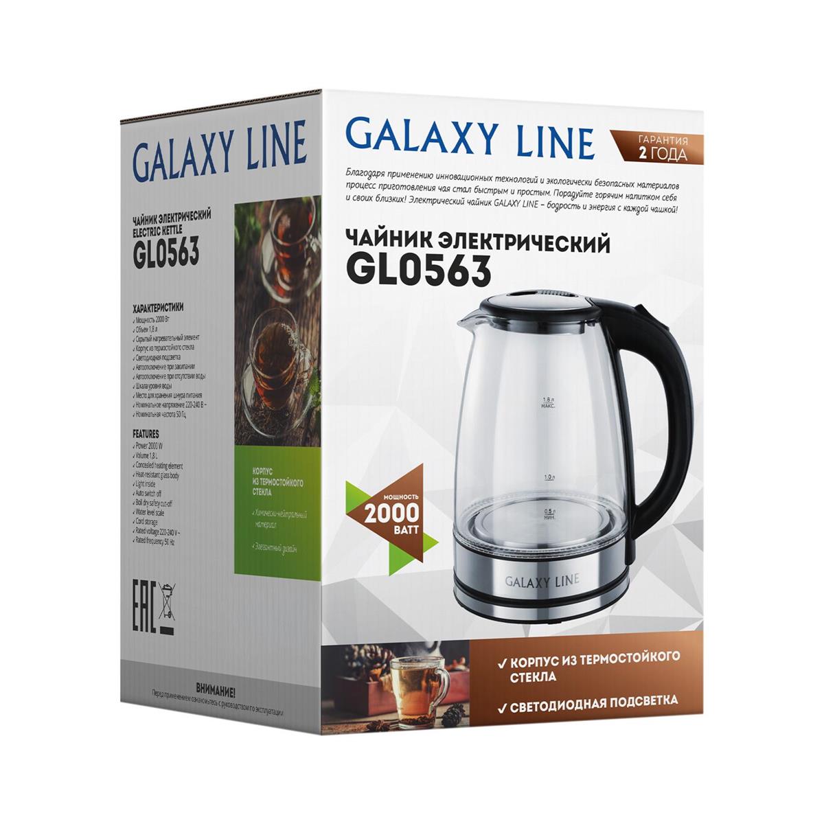 Электрический чайник GALAXY LINE GL 0563 (2000 Вт/1,8 л /стекло/прозрачный, черный, серебристый)