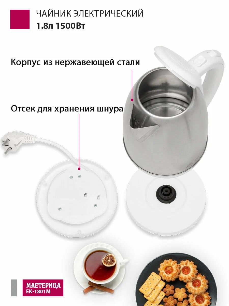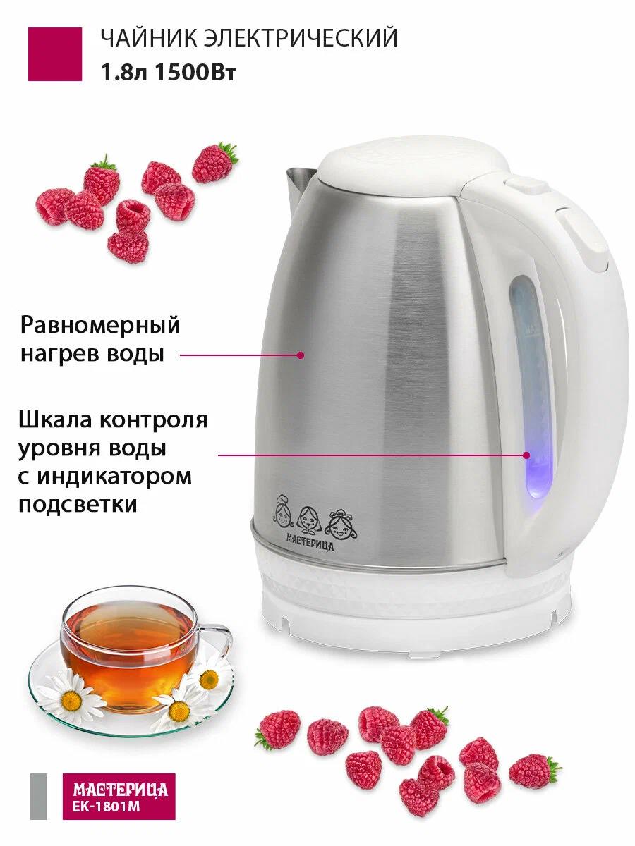 Электрический чайник Мастерица EK-1801М (1500 Вт/1,8 л /металл, пластик/белый, нержавеющая сталь) - Интернет-магазин Позитив: бытовая техника, электроника, товары для дома и др.