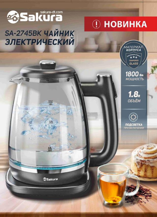 Электрический чайник Sakura SA-2745BK (1800 Вт/1,8 л /стекло, пластик/прозрачный, черный) - Интернет-магазин Позитив: бытовая техника, электроника, товары для дома и др.
