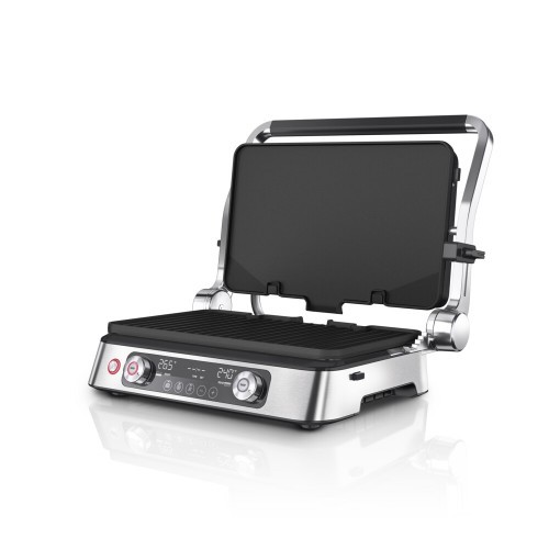 Мультигриль Braun CG9140 – это стиль и функциональность на вашей кухне. В комплект входят две съемные пластины с антипригарным покрытием. Рифленая подойдет для стейков, птицы и рыбы, на гладкой удобно жарить яичницу, овощи и морепродукты. Температура нагрева задается в диапазоне от 60 до 265 градусов отдельно для каждой поверхности при помощи поворотных регуляторов. Прибор оповестит о готовности к работе звуковым сигналом – пора приступать к закладке продуктов! Задать продолжительность приготовления можно при помощи таймера. Специально для быстрой прожарки в начале готовки есть режим Sear – оптимальный вариант для толстых кусков мяса. Стейки получатся сочные внутри и золотистой корочкой снаружи. Все параметры работы и активные установки гриля DeLonghi отображает встроенный дисплей. Излишки жира стекают в специальный поддон. Он, как и пластины, легко снимается для очистки. Пластины можно мыть в посудомоечной машине.