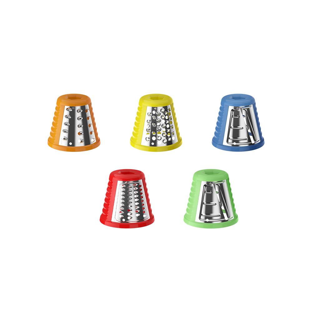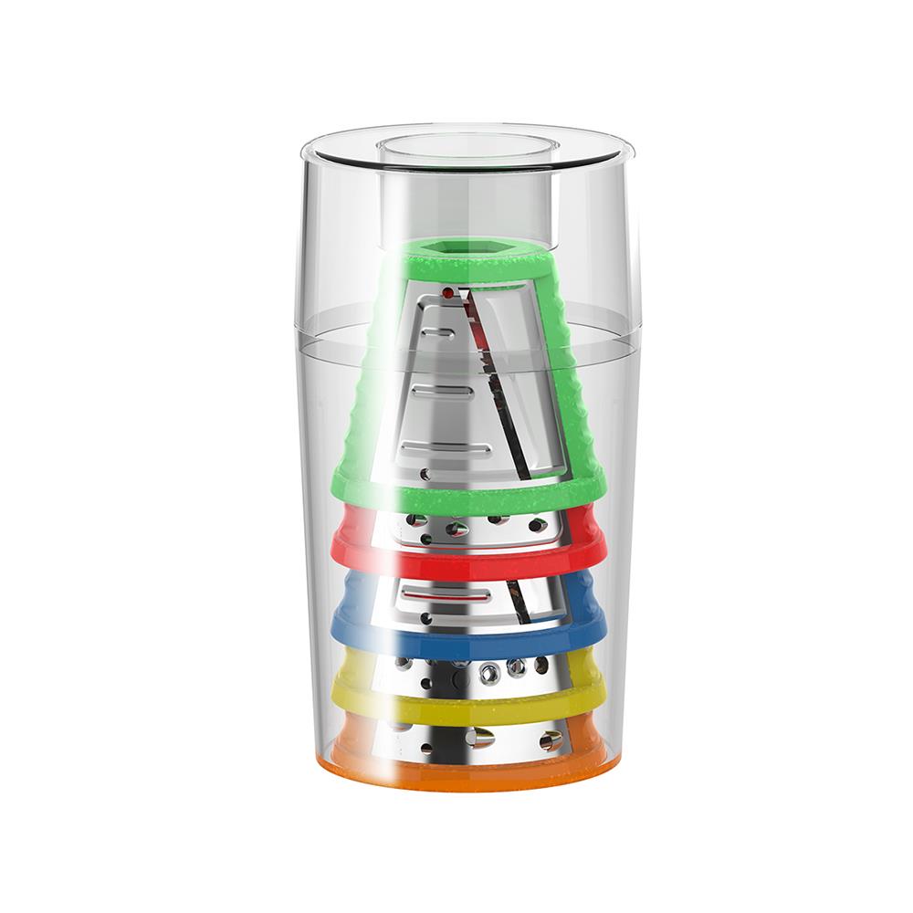 мелкая терка, крупная терка, терка-измельчитель, шинковка для тонких ломтиков, шинковка для крупных ломтиков, органайзер для хранения сменных насадок, толкатель