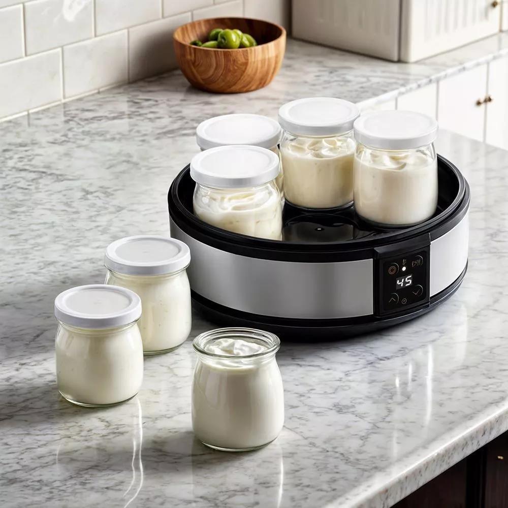 Вместе с йогуртницей идут 7 стеклянных баночек с пластиковыми навинчивающимися крышками. Ёмкость каждой баночки составляет 180 мл. Стекло сохраняет натуральные свойства домашнего йогурта, а также является экологически чистым материалом. Вы можете установить время приготовления от 1 до 48 ч с шагом 1 ч, а температуру — в диапазоне от 25 до 50 °C с шагом 1 °C. С помощью кнопок увеличения и уменьшения можно увеличить или уменьшить время работы или температуру.