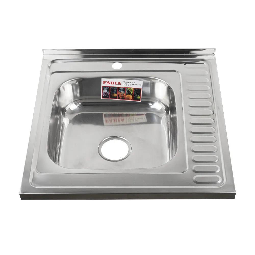 Накладная мойка FABIA из нержавеющей стали толщиной 0,6 мм – отличный вариант для кухни , она прослужит многие годы. Классическая форма и хромированный цвет гармонично впишутся в любой интерьер и никогда не выйдут из моды. Оптимальный размер 60х60 см с площадкой для посуды и глубиной 160 мм позволяет свободно помыть посуду, без страха её разбить. Мойка устанавливается на тумбочку. Практичная площадка, расположенная по центру , даёт возможность вмонтировать любую понравившуюся модель смесителя. В комплекте сифон с большой горловиной с переливом