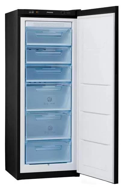 Морозильная камера «Позис» FV NF-117 черного цвета потребляет 310 кВт в год. Она оснащена системой No Frost и не требует разморозки. Общий объем морозильной камеры составляет 228 л. У нее одно отделение с шестью ящиками. Управление моделью механическое. Дверца открывается направо. При необходимости ее можно перенавесить. Морозильная камера способна поддерживать температуру в течение 9 часов с момента отключения от электросети. Во включенном состоянии она издает шум максимальной мощностью 40 дБ. Дверца у агрегата металлическая. Морозильная камера относится к А-классу энергоэффективности.