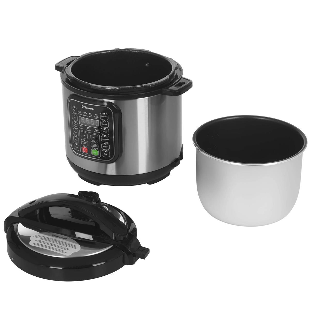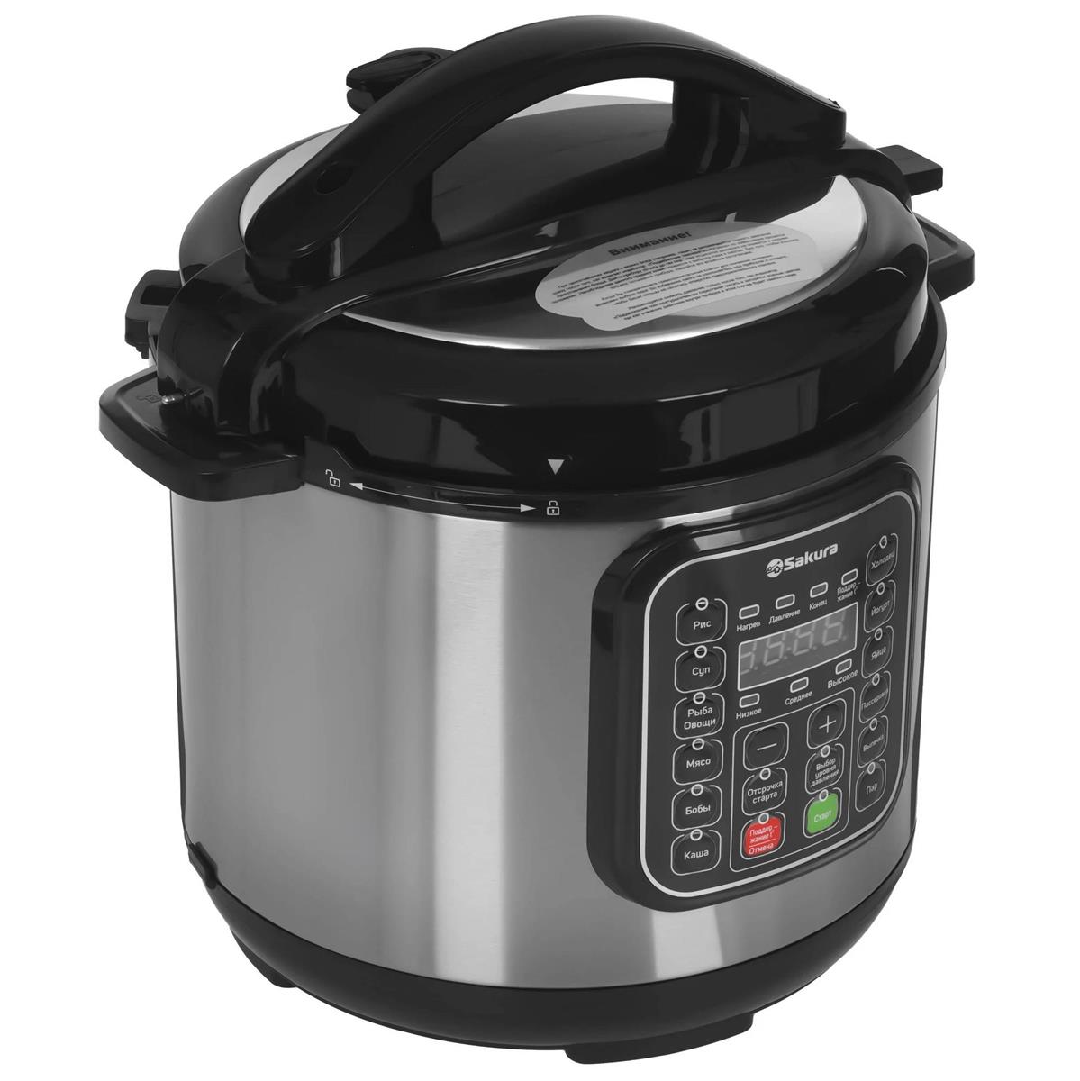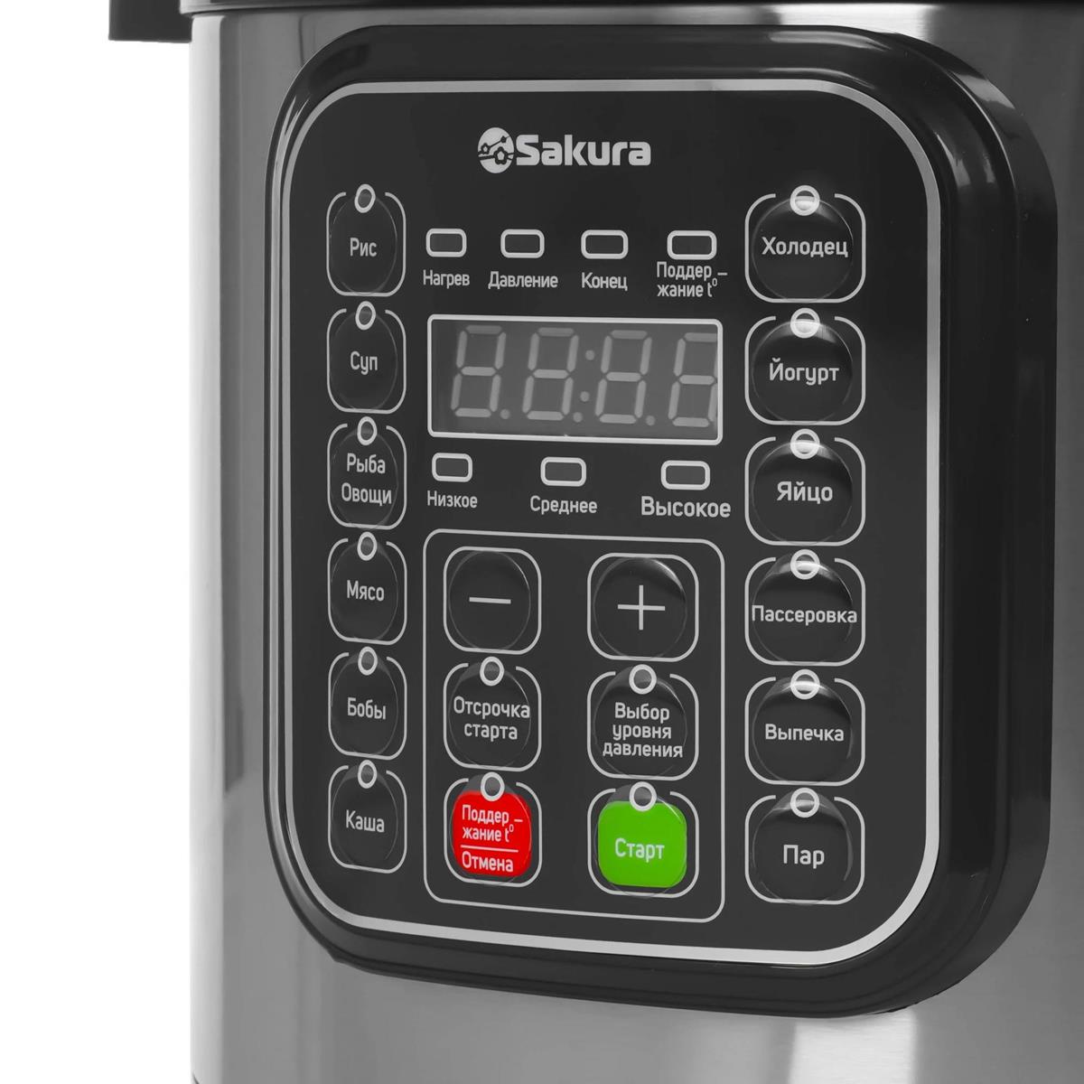 Мультискороварка 6 л, 1000 Вт, LED дисплей, кнопочное управление, поддержание тепла и отложенный старт (до 24 ч), чаша алюминиевая с антипригарным покрытием, корпус из нерж. стали, 12 режимов: рис, суп, рыба/овощи, мясо, бобы, каша, холодец, йогурт, яйцо, пассеровка, выпечка, пар. Комплектация: мерный стакан, ложка. Цвет: нерж.сталь/черный. Подходящая модель чаши: SA-PC07N. Шнур 1м.