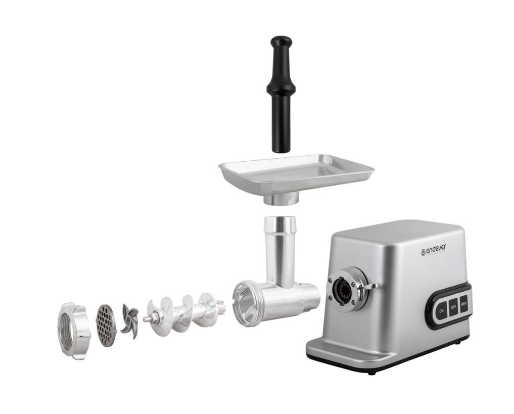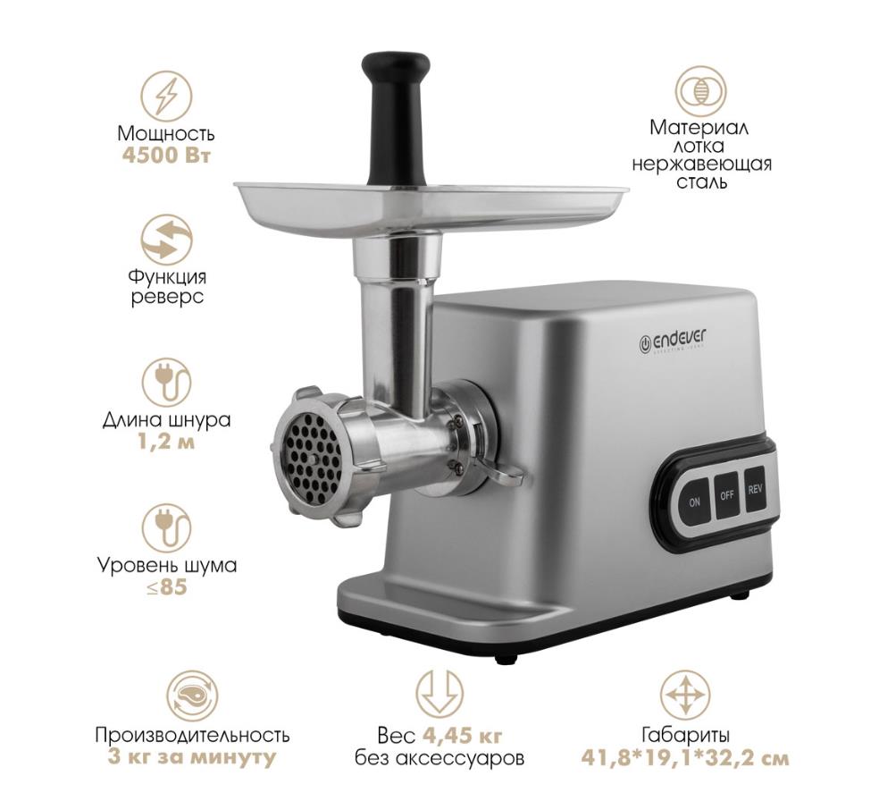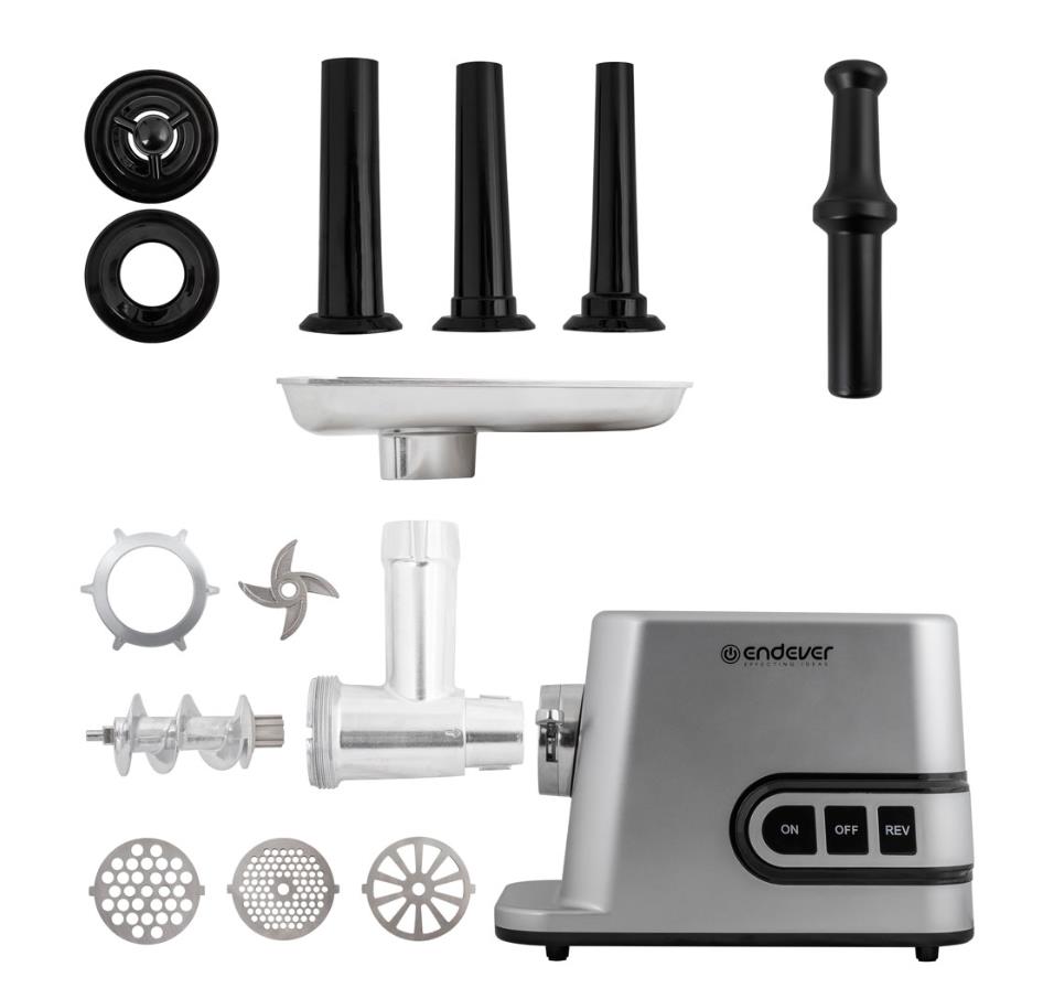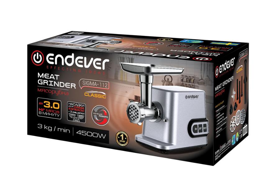 ENDEVER SIGMA-112 с высокой мощностью 4500 Вт отлично справляется с жестким мясом и другими продуктами, перерабатывает большое количество мяса — до 3 кг/мин. Широкое выводящее отверстие диаметром 65 мм обеспечивает большую проходимость продуктов. Функция реверса поможет очистить мясорубку от застрявшего мяса и жил без приостановки работы. Комплектация мясорубки представлена 3 решетками: с отверстиями на 4 мм и 7 мм, а также с 10 отверстиями. Так вы сможете регулировать крупность помола мяса для различных блюд. Также к мясорубке прилагаются насадки для приготовления кеббе и колбас. Прочные материалы гарантируют надежное пользование устройством. Поэтому в ENDEVER SIGMA-112 металлический загрузочный лоток и кованый стальной нож. Установленная защита от перегрева позволяет избежать поломок устройства благодаря тому, что в нужный момент останавливает работу мясорубки. Уровень шума при работе с этой мясорубкой не превышает ≤85 дБ. Вес изделия составляет около 5 кг с аксессуарами, а размеры — 41,8*19,1*32,2 см. Устойчивость всей конструкции на поверхности обеспечивают нескользящие прорезиненные ножки.