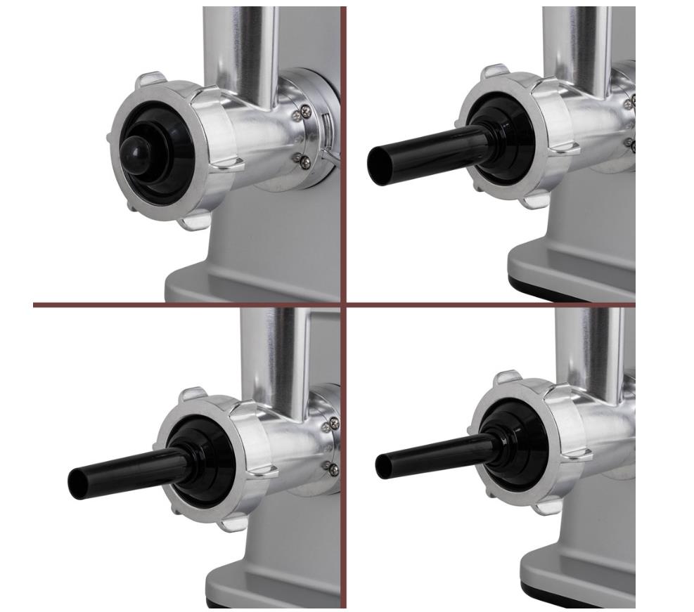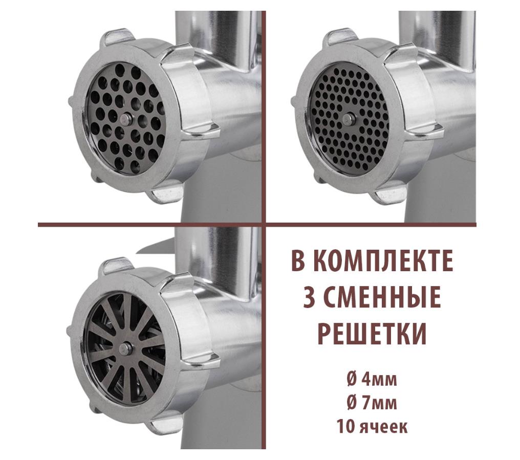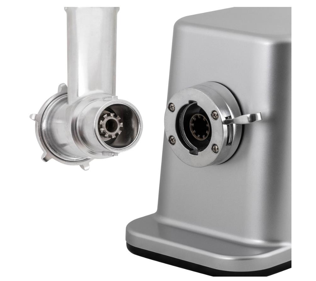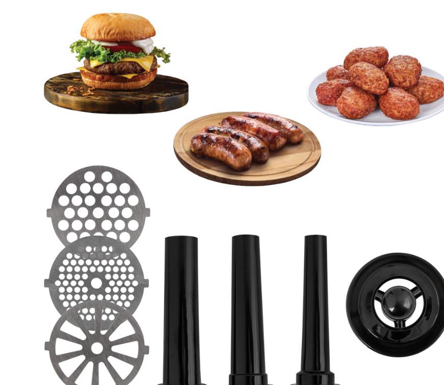ENDEVER SIGMA-112 с высокой мощностью 4500 Вт отлично справляется с жестким мясом и другими продуктами, перерабатывает большое количество мяса — до 3 кг/мин. Широкое выводящее отверстие диаметром 65 мм обеспечивает большую проходимость продуктов. Функция реверса поможет очистить мясорубку от застрявшего мяса и жил без приостановки работы. Комплектация мясорубки представлена 3 решетками: с отверстиями на 4 мм и 7 мм, а также с 10 отверстиями. Так вы сможете регулировать крупность помола мяса для различных блюд. Также к мясорубке прилагаются насадки для приготовления кеббе и колбас. Прочные материалы гарантируют надежное пользование устройством. Поэтому в ENDEVER SIGMA-112 металлический загрузочный лоток и кованый стальной нож. Установленная защита от перегрева позволяет избежать поломок устройства благодаря тому, что в нужный момент останавливает работу мясорубки. Уровень шума при работе с этой мясорубкой не превышает ≤85 дБ. Вес изделия составляет около 5 кг с аксессуарами, а размеры — 41,8*19,1*32,2 см. Устойчивость всей конструкции на поверхности обеспечивают нескользящие прорезиненные ножки.