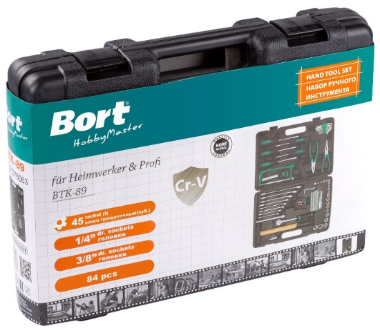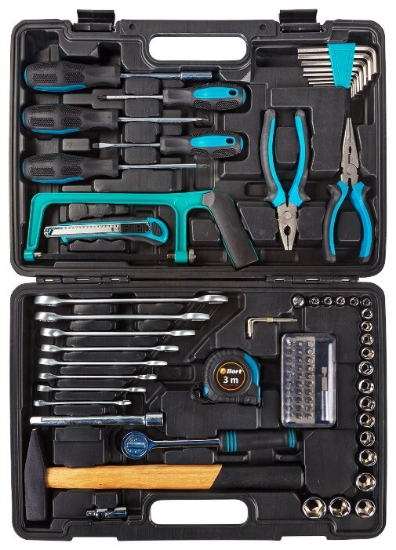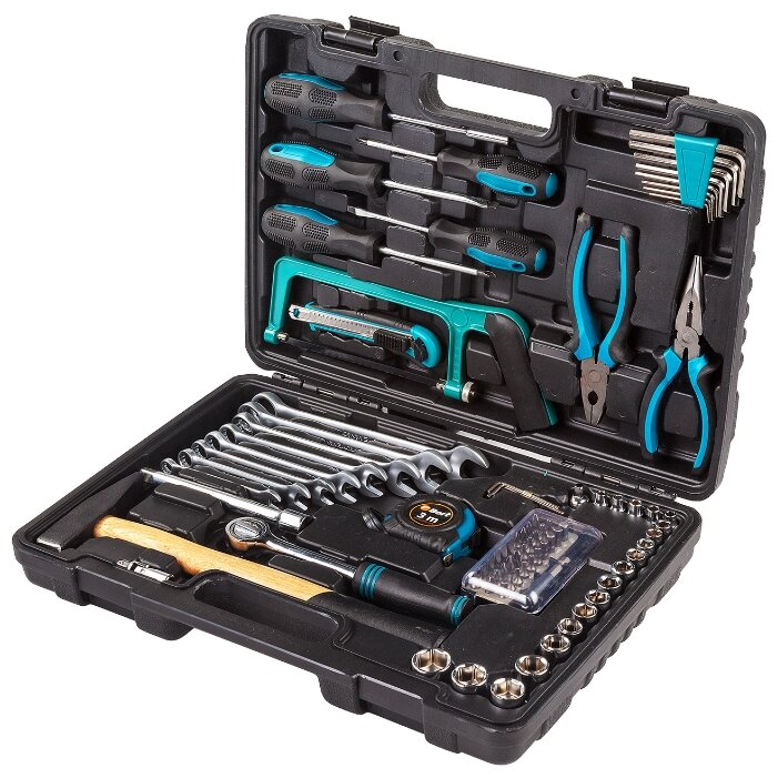 Инструменты в комплекте: ключи имбусовые (шестигранные), ключи гаечные, ножовка по металлу, длинногубцы, плоскогубцы, трещотка, рукоять для бит, отвёртки, молоток