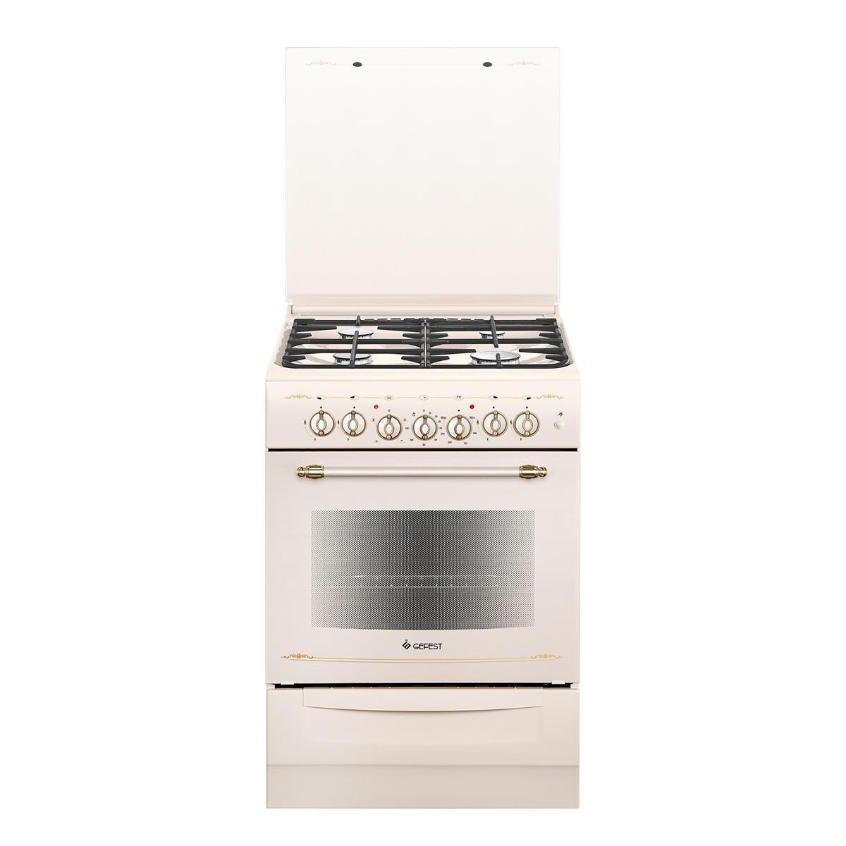Gefest ПГЭ 6102-02 0186 — это комбинированная кухонная плита, выполненная в элегантном ретро-дизайне кремового цвета. Модель сочетает газовую варочную панель и многофункциональную электрическую духовку.