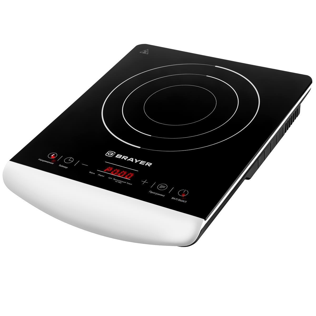 Настольная индукционная плита Brayer BR2801 выполнена в корпусе из белого пластика, варочная панель — из стеклокерамики черного цвета. Эта модель оснащена одной конфоркой мощностью 2 кВт (диаметр — 21 см) и сетевым кабелем длиной 1,2 м. В устройство заложены пять автоматических режимов. Максимальная температура нагрева — 270°С. Управление обеспечивает сенсорная панель с дисплеем, есть возможность установить таймер.
