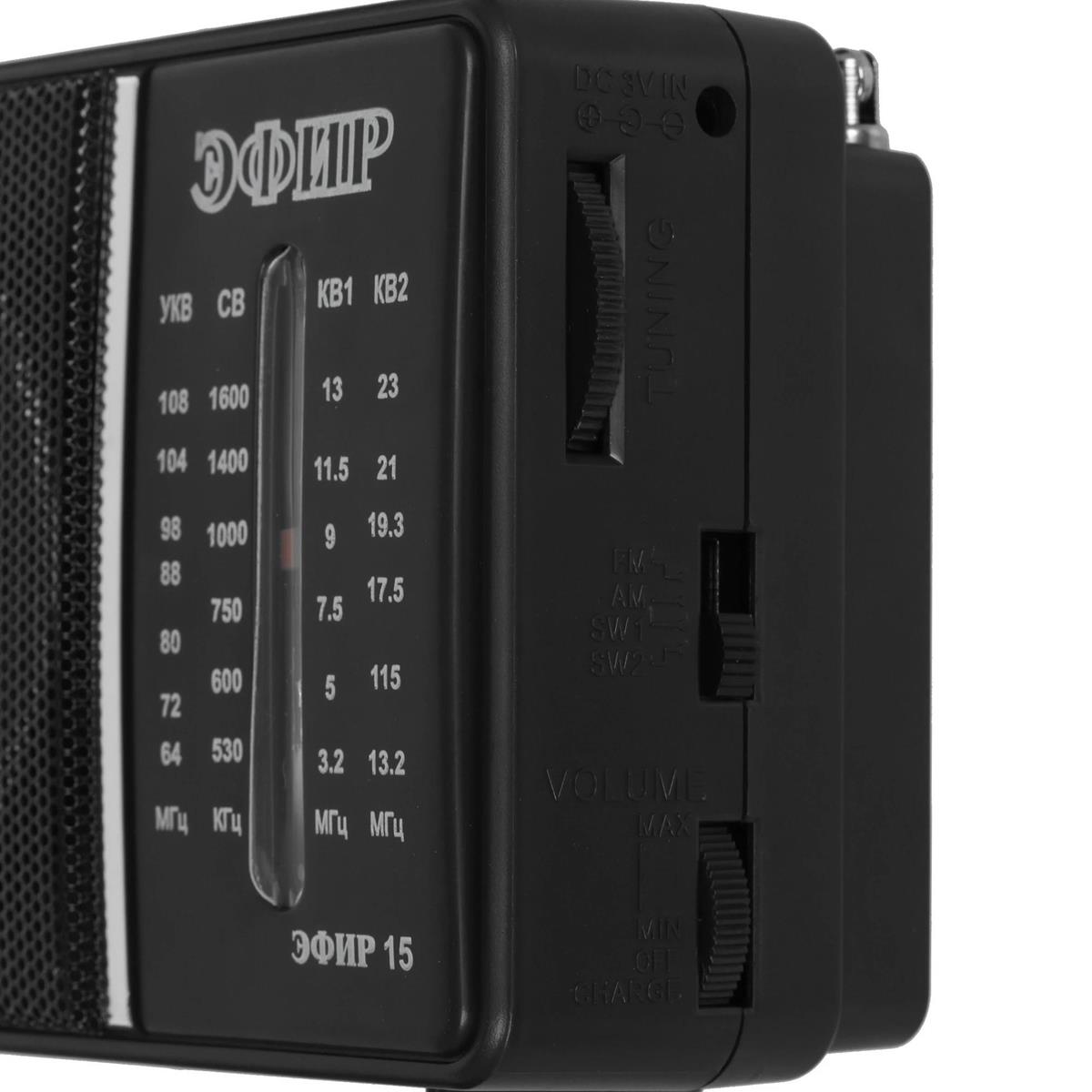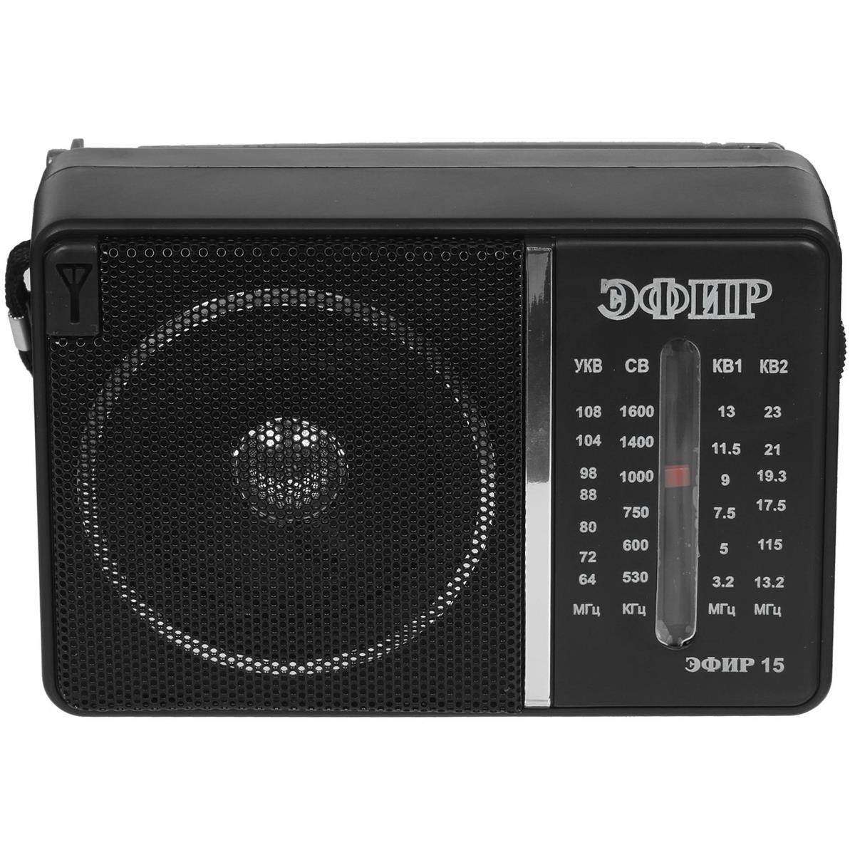 Радиоприемник ЭФИР 15, УКВ 64-108МГц, СВ 530-1600КГц, КВ1,КВ2 бат. 2*R20(D) черный