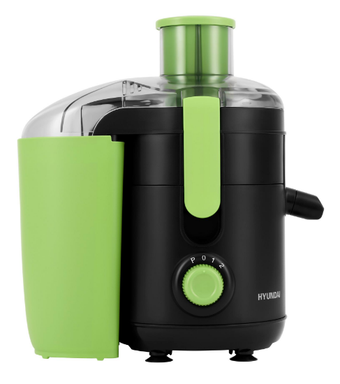 Hyundai JE1625 – это механическая центробежная соковыжималка из лёгкого пластика, которая отлично справляется с большинством плодов и занимает мало места. Мощность прибора составляет 500 Вт, а доступных скоростей в нём две – этого достаточно, чтобы получить сок из большинства овощей и фруктов. Устройство использует центробежную силу, чтобы отделять мякоть, для неё есть отдельный резервуар на 1000 мл. Разовый объём сока, на который рассчитана соковыжималка, 400 мл – это стандартный стакан.