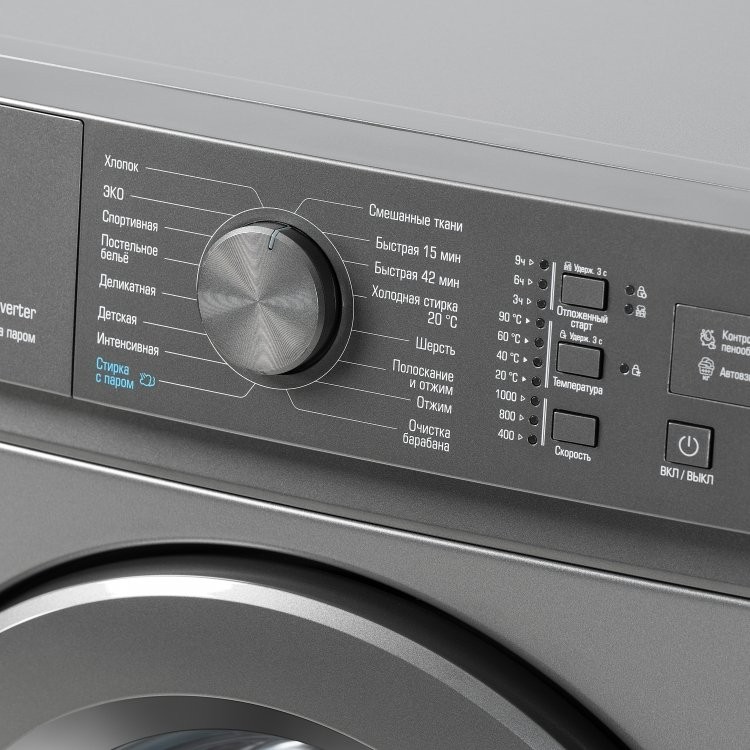 Узкая стиральная машина с инверторным мотором и функцией самоочистки барабана.
