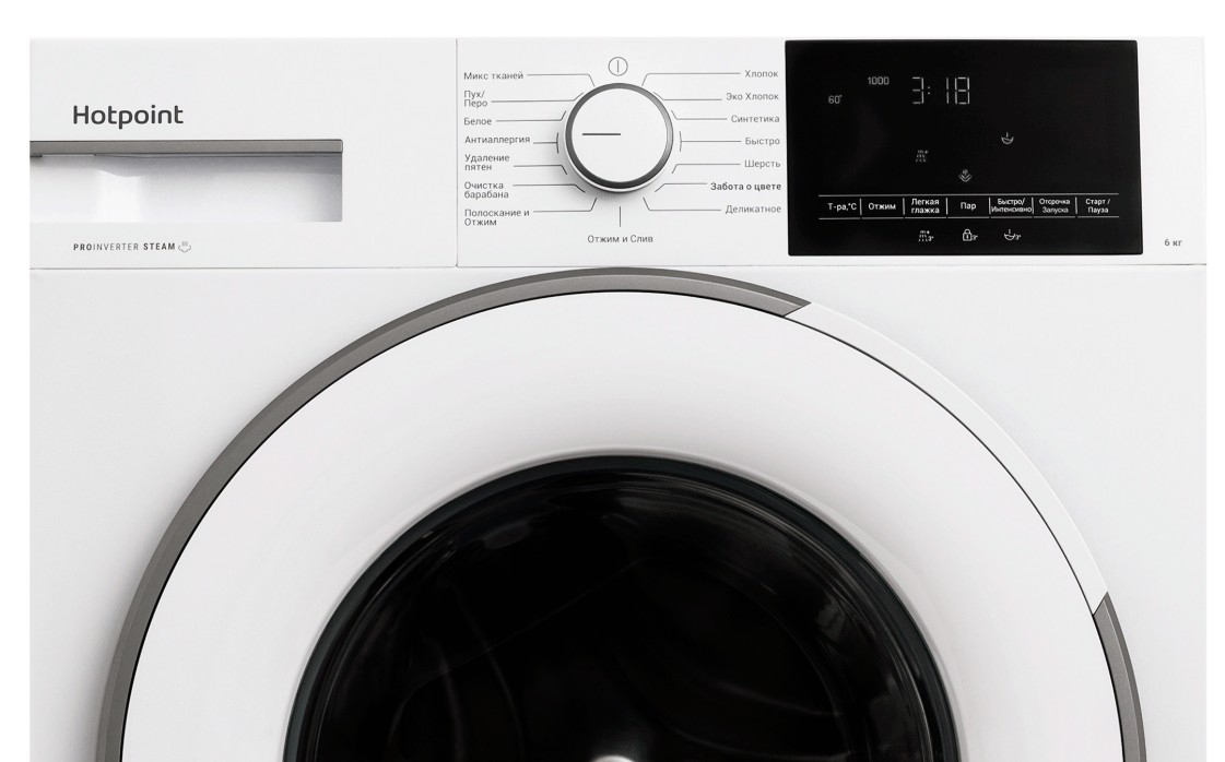 Узкая стиральная машина Hotpoint WSH 6090 VWW управляется с помощью кнопок и поворотного регулятора. Дисплей и система индикации информируют о заданных параметрах, этапах и времени.