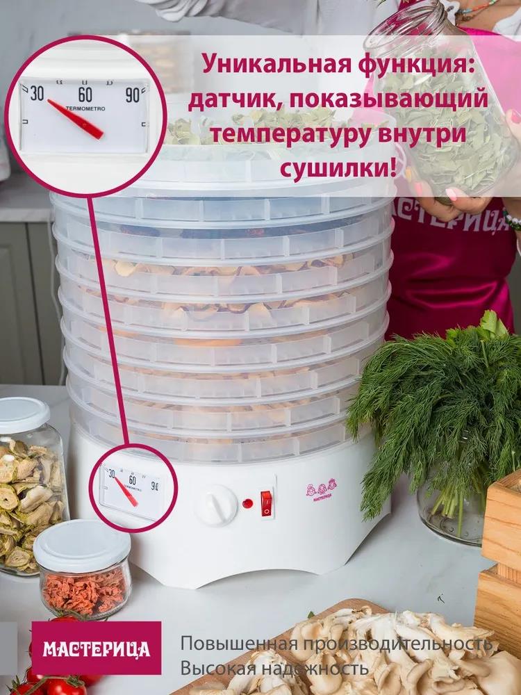 Сушилка для овощей и фруктов Мастерица 6 прозрачных поддонов + 3 белых поддона в подарок. Конвекционная электросушилка имеет прочный биметаллический термометр, который безошибочно показывает температуру сушки, а это очень Важно для бережной сушки, когда Вы видите реальную температуру внутри дегидратора. Аналогичного термометра Вы не встретите в комплектации других сушилок. Сушилка для овощей и фруктов Мастерица EFD-0903VM, имеет индикацию включения прибора, бокс для хранения электрошнура, электрошнур сушилки армирован вилкой с заземлением, клапаном регулировки потока воздуха. Лотки снабжены клапанами центрального отверстия, для равномерного распределения потока воздуха между лотками. Изготовлена из пластика с высоким тепловым сопротивлением, что сокращает время сушки.