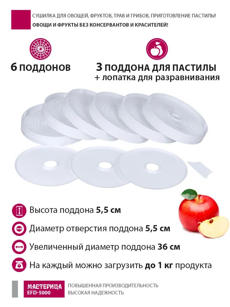 Сушилка для овощей Мастерица EFD-5000, 6 белых поддонов + 3 поддона д/пастилы 500Вт, увеличенный D поддона 36 см (поддонов 6 шт, 500 Вт , белый)