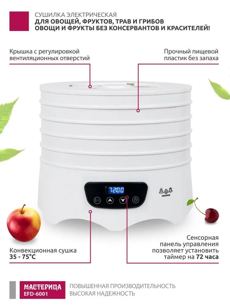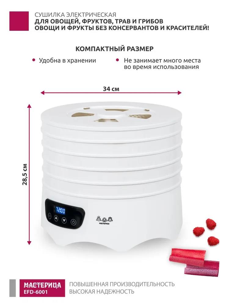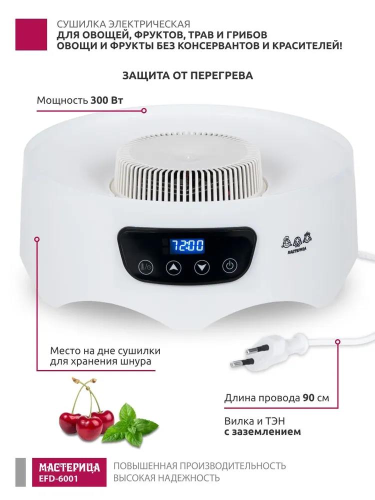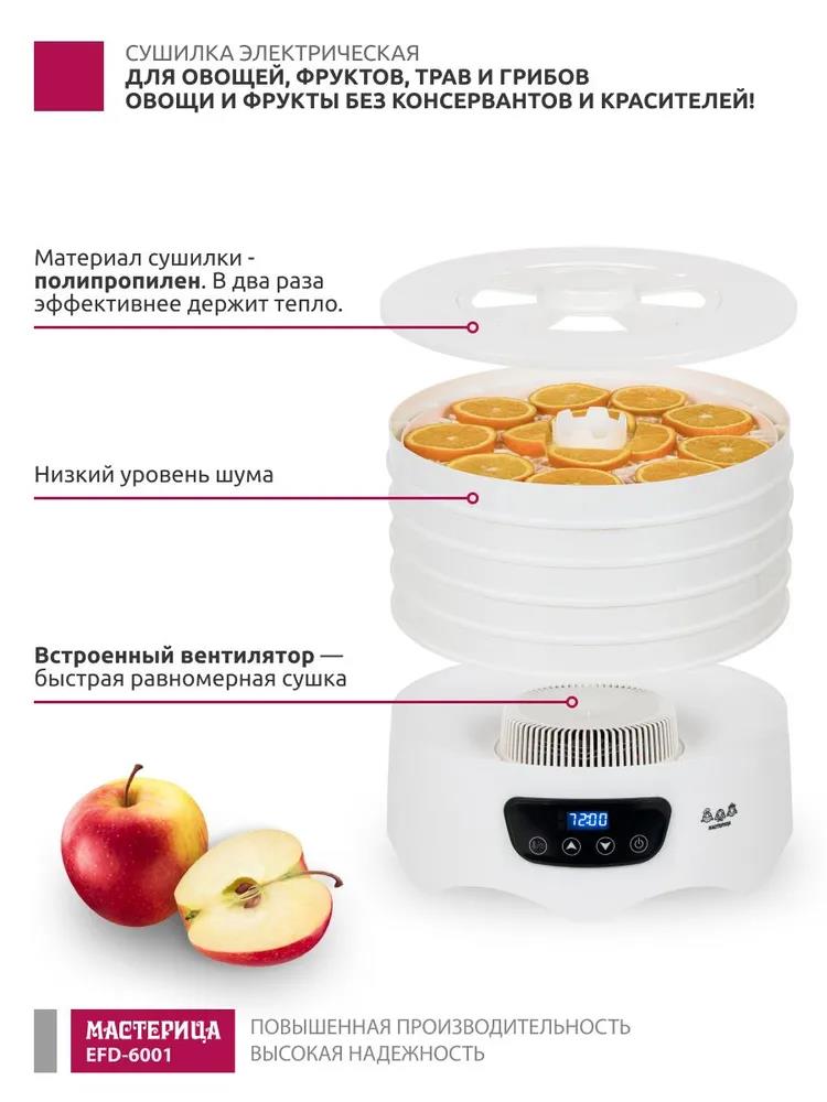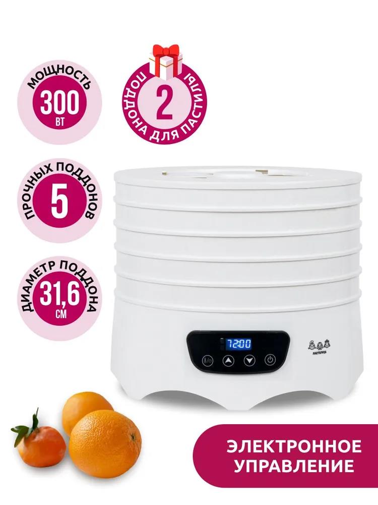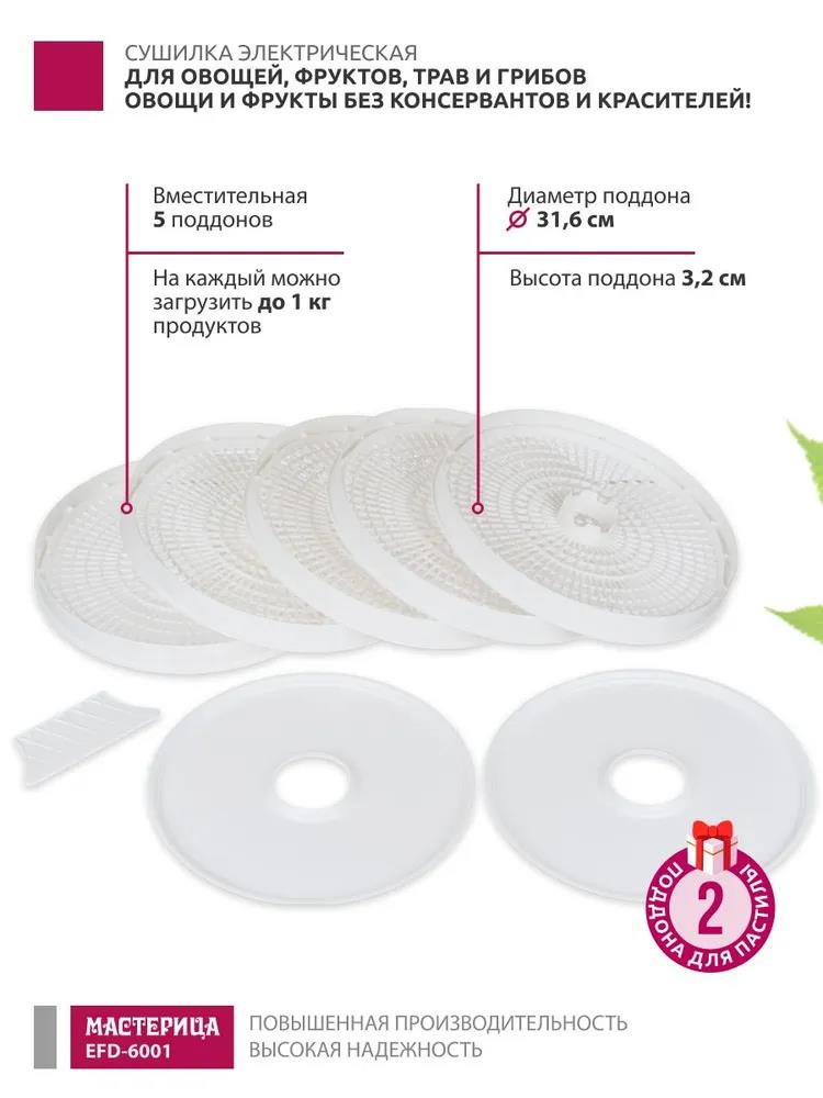 Сушилка для овощей Мастерица EFD-6001, 5 белых поддонов + 2 поддона д/пастилы 300Вт, D 31.6 см (поддонов 5 шт, 300 Вт , белый)