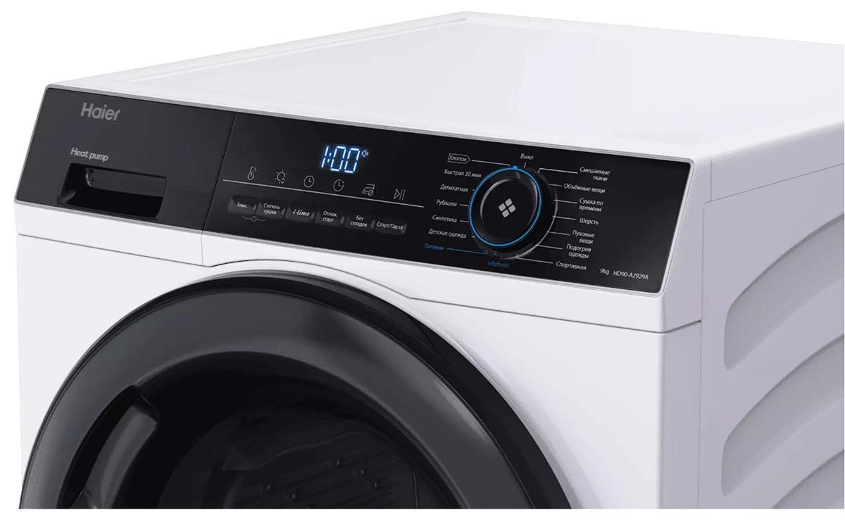 Полноразмерная сушильная машина Haier HD90-A2929A подходит для всех типов тканей, включая шерсть, пуховые и спортивные вещи. Настройки гибкие: вам доступно 15 программ и три степени сушки, опция удаления запахов i-Refresh и режим «Без складок», который позаботится о вещах, если вы забыли вовремя достать их из барабана. Haier HD90-A2929A вмещает до 9 кг белья. Сушка осуществляется за счет теплового насоса — это самая продвинутая технология на данный момент с энергопотреблением класса A++. При этом модель не громкая, уровень шума 65 дБ(А) позволяет запускать ее ночью без риска разбудить близких. Отложенную сушку можно активировать с помощью таймера (время задержки — от 0 до 12 часов).