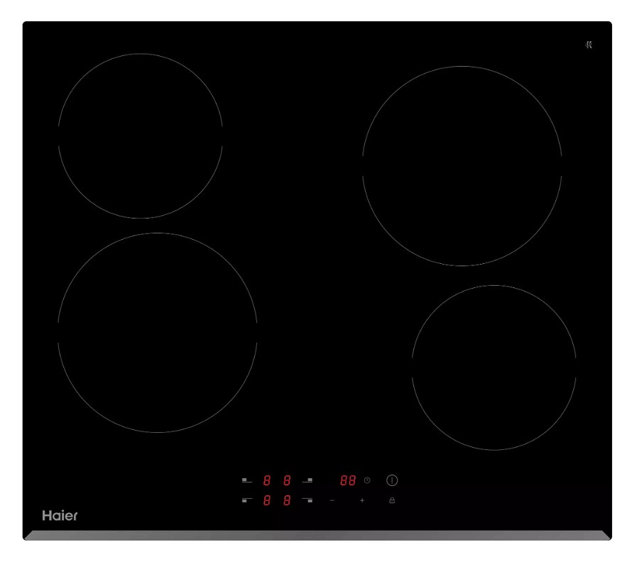 Haier HHY-C64RVB — это встраиваемая электрическая варочная панель типа Hi-Light с независимым управлением. Она выполнена из черной стеклокерамики со скошенным передним краем.