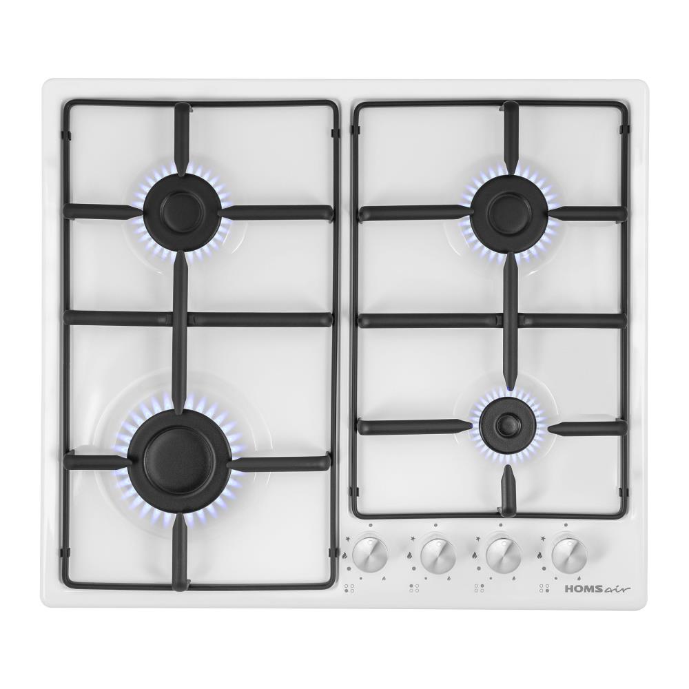 Газовая варочная поверхность HOMSair HGE643GWH представлена в белом цвете, что делает ее подходящей для любых кухонь.