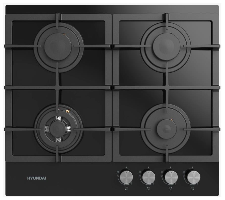 Hyundai HHG 6434 BG – это функциональная варочная поверхность, работающая на газу и устанавливающаяся независимо. Корпус плиты выполнен из сочетания чугуна и закалённого стекла, оба они обеспечивают долгий ресурс работы, устойчивы к физическим повреждениям и легко очищаются от любых бытовых загрязнений без специальных средств. Четыре конфорки, которыми оснащена данная модель, имеют различную конфигурацию, чтобы обеспечить идеальный режим тепловой обработки для любых видов продуктов. Одна из них (левая ближняя) – двухконтурная и мощностью 2500 Вт, на ней удобно готовить WOK. Другая ближняя конфорка работает на 900 Вт, а оставшаяся дальняя пара – на 1700 Вт. Все они оснащены автоматическим электроподжигом и управляются четырьмя поворотными регуляторами. В них же находятся и кнопки, отвечающие за пуск искры.