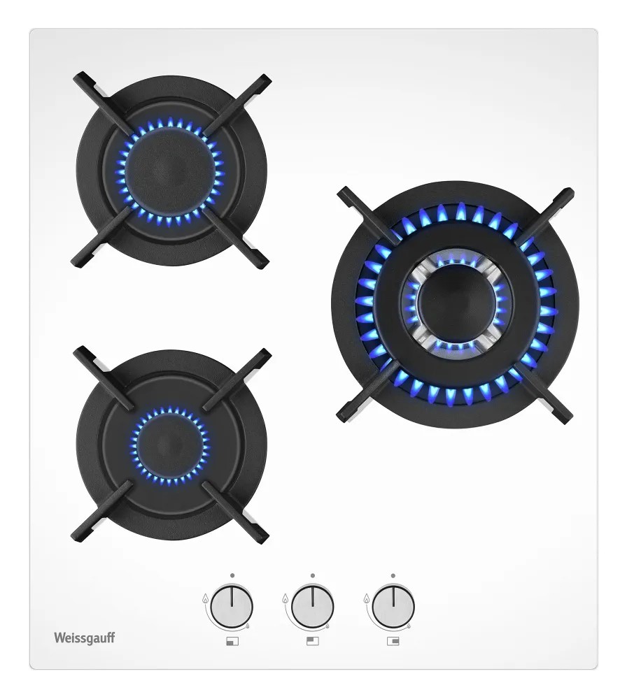 Встраиваемая независимая газовая панель Weissgauff шириной 45 см, исполненная в закалённом белом стекле - это стильное и компактное решение для вашей кухни!