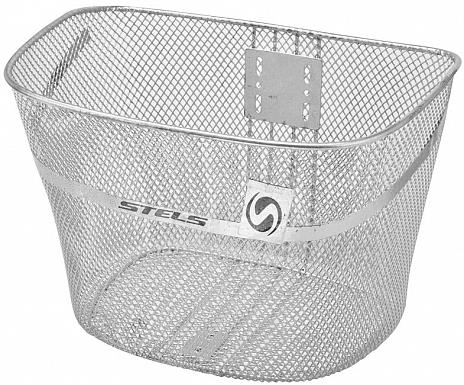 Велокорзина JL-044-4 передняя стальная серебристая с логотипом STELS, размер 35х24,5х28см, стойки для 28" с креплением за проушины вилки