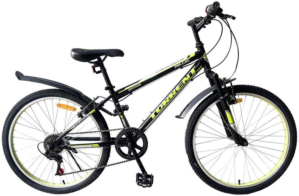 Велосипед TORRENT Magic - это горный велосипед, предназначенный для подростков и взрослых с ростом до 155 см. Он подходит для езды по городским велодорожкам, пересеченной местности, а также для сельских и загородных прогулок. Рама велосипеда выполнена из стали, что обеспечивает прочность и долговечность конструкции. Семискоростная система позволяет перемещаться по дорогам со сложным рельефом, включая ямы, горки и пологие спуски. Комфортность езды обеспечивается за счет мощного переднего амортизатора, который гасит толчки и вибрации при столкновении колес с препятствиями. Ободья колес двойные, декорированные в черный цвет, и оснащены шинами со «злым» рисунком протектора, адаптированными для езды по грунтовым дорогам и дорогам с твердым покрытием. Руль велосипеда имеет ширину 60 см и оснащен логотипами. Передний и задний тормоз рычажный «V-brake» обеспечивает надежное торможение. Сиденье средней мягкости регулируется по высоте с помощью ручного зажима «Quick release».