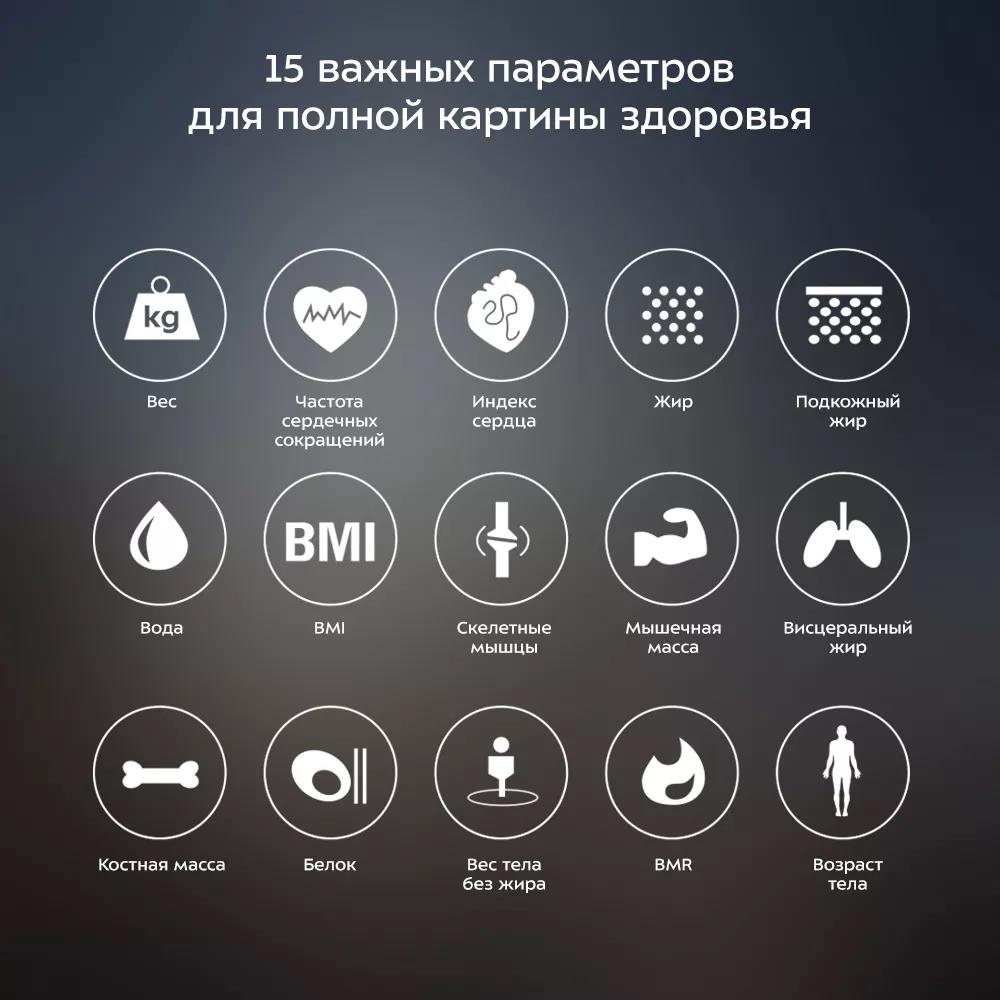 15 параметров за 5 секунд! В течение 5 секунд после взвешивания, в приложении отразятся важнейшие параметры вашего тела. Среди них: вес, возраст тела, содержание воды, белка, жира и костной массы в вашем организме, общий баланс вашего тела и многие другие.